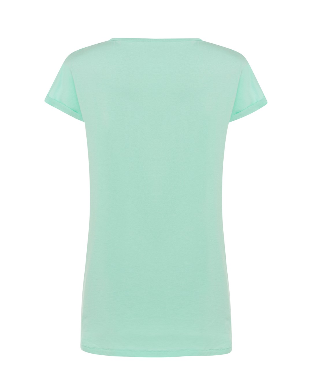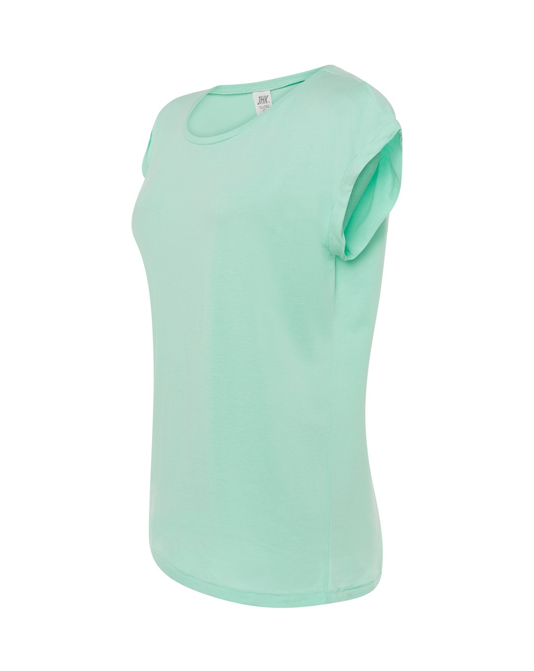 Bluzka damska z krótkim rękawem. Single jersey. Rękawy obszyte, szeroki okrągły dekolt.