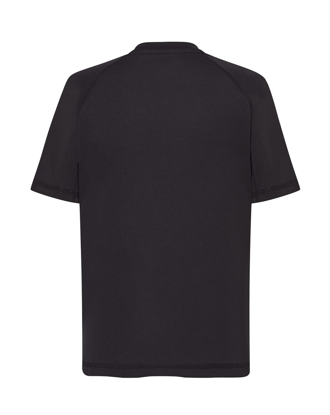 T-shirt dziecięcy z krótkim rękawem. Reglanowy rękaw z ozdobnym przeszyciem. Oddychający materiał szybkoschnący. Łatwo usuwalna metka. 100% poliester teksturowany.